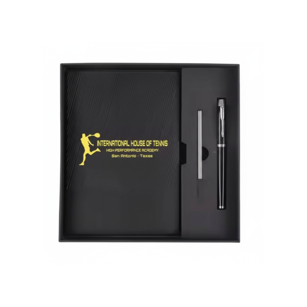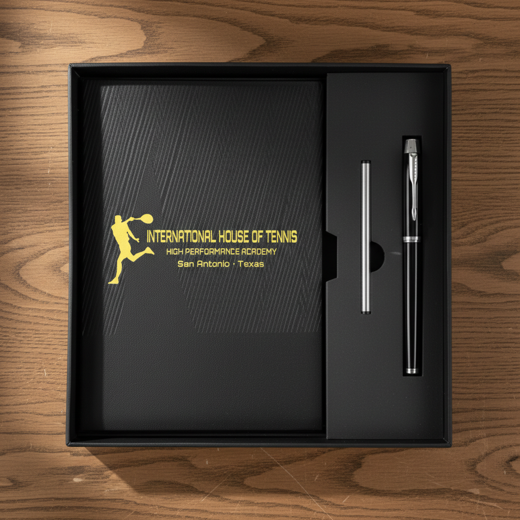 A premium leather planner designed for International House of Tennis students to track daily practice, match notes, and training goals. Clean, durable, and professional, perfect for building focus and consistency on and off the court. Includes a smooth writing metal pen.